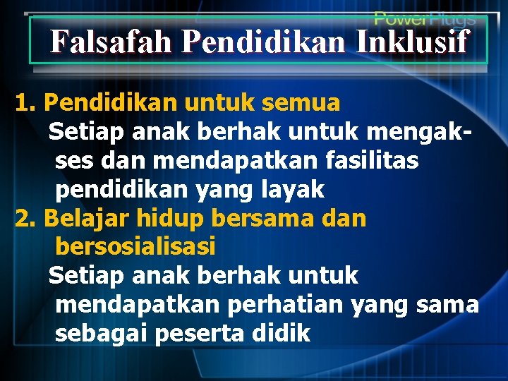 113 Dasar pendidikan inklusif Dalam dasar pendidikan inklusif ia terbahagi kepada dua dasar yang utama iaitu dasar kebangsaan di Malaysia dan dasar antarabangsa. Sistem yang harus disesuaikan dengan anak bukan anak yang menyesuaikan diri dengan sistem. Program Pendidikan Inklusif ertinya suatu program pendidikan bagi murid berkeperluan pendidikan khas yang dihadiri oleh murid berkeperluan pendidikan khas bersama- sama dengan.