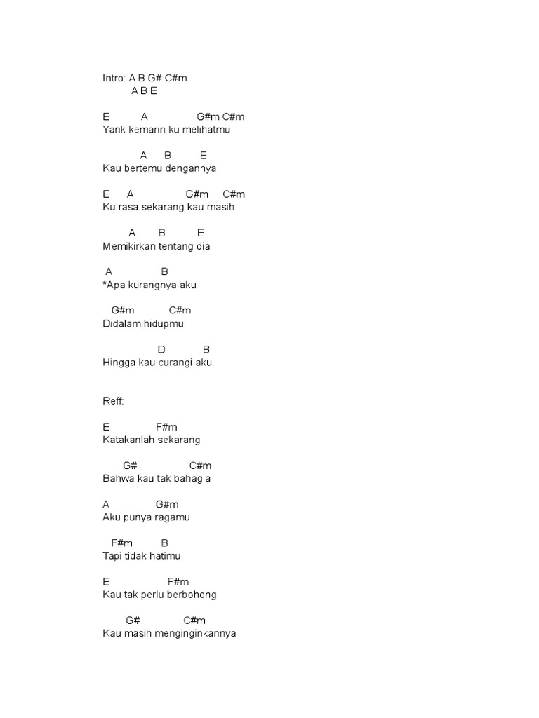 Bahwa kau tak bahagia. Verse 2 Yang ku rasa sekarang kau. Yang kemarin ku melihatmu Kau bertemu dengannya Ku rasa sekarang kau masih Memikirkan tentang dia Apa kurangnya aku didalam hidupmu Hingga kau curangi aku Katakanlah sekarang bahwa kau tak bahagia Aku punya ragamu tapi tidak hatimu Kau tak perlu berbohong Kau masih menginginkannya Ku rela kau dengannya Asalkan kau bahagia Yang ku rasa sekarang kau masih Memikirkan tentang dia.