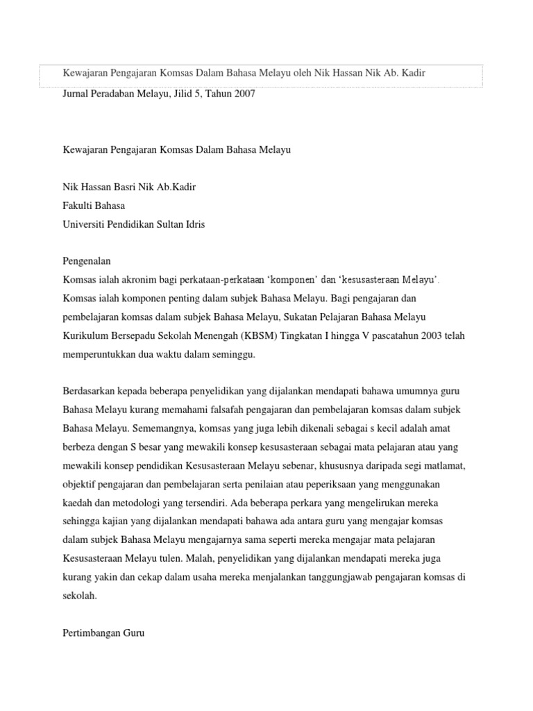 Kewajaran Pengajaran Komsas Dalam Bahasa Melayu Oleh Nik Hassan Nik Ab Pdf